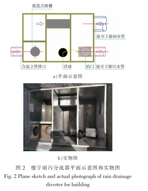 楼宇雨污分流器(见图2)是针对混接排水立管分流改造的一体化设备,设置在排水立管末端,一般埋地安装。其本质是在槽堰结合式截流井的基础上,增设微型提篮式格栅来除渣以免堵塞,增设浮球控制的拍门削减雨天较清洁的排水进人下游污水管。设备使用前需调查混接排水立管接入情况,严禁马桶或蹲坑污水接人,以免较大杂物堵塞进水口使其功能丧失。另外,由于上游管道基本没有调蓄容量实际使用中瞬时排水量较大时,容易造成污水溢流进入下游雨水管。