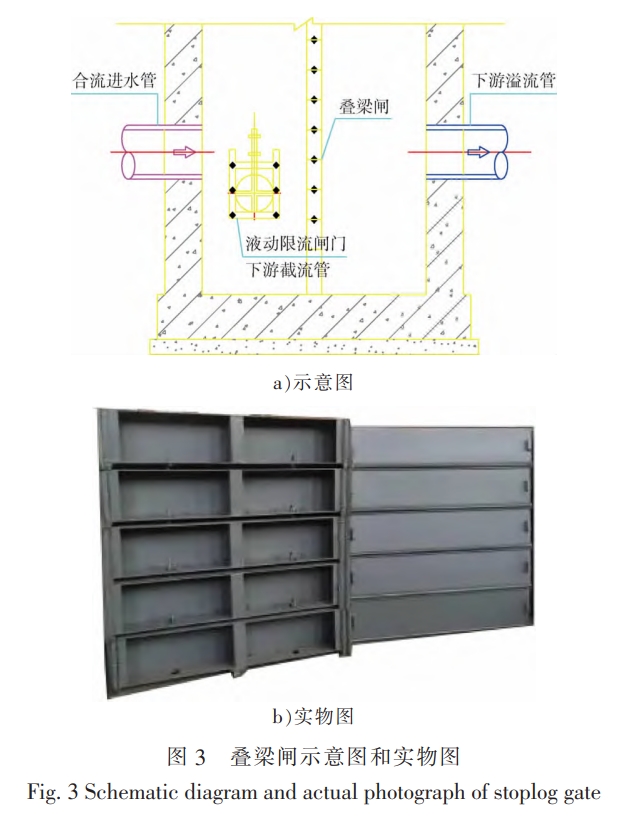 采用由多块阀板组成的叠梁闸(见图3)替代固定堰高堰墙,设置钢丝牵引叠梁闸,四周采用止水胶条封堵,打开或闭合不同数量的阀板以实现截流量的调配,用以适配不同降雨历时或暴雨强度的降雨。叠梁闸较传统堰式截流井使用更加灵活,但存在渗漏问题。