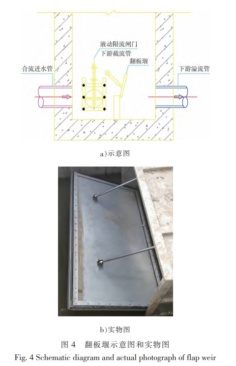 采用翻板堰(见图4)替代固定堰高堰墙,堰系统配有倾角仪和上、下限位开关,设定井内警戒液位,采用液位仪监测堰门前井内液位和堰门后自然水体液位。当井内液位大于警戒液位且至少大于自然水体液位0.1m时,翻板堰由闭合状态变为开启状态,开启角度可以调节,进而控制出水管方向的流量。翻板堰主要适用于小排口截流改造。