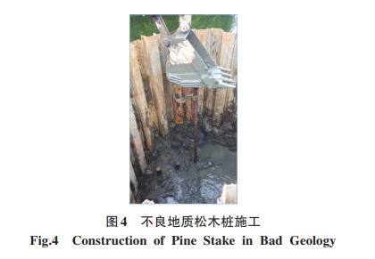 (1) 围堰和地基处理:截流井采用拉森钢板桩围堰止水,可以充当临时挡土、挡水的围护结构;采用PC-200型长臂挖掘机对截流井周边河道进行清淤:对于不良地质(如淤泥层)通过打松木桩、抛石挤淤、铺设砂石垫层等措施进行地基加固处理”,如图4所示。