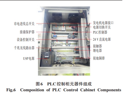 PLC电气控制柜由总开关、电源接口和切换开关、浪涌保护器、PLC控制器、千兆无线路由器、接触器、继电器、USP电源等元器件组成。PC即可编程逻辑控制器,是电气设备自动化控制的核心”,执行对电气设备的运行逻辑控制、时间控制、模拟控制等控制功能:USP是一种高质量、高可靠性的独立电源,通过将市电交流电整流后储存;继电器作为指令中转站通过指令信号达到预定动作效果,实现电气设备自动化;接触器一般是内部的吸合线圈来控制它的动作与否,而控制线圈又与各种类型的继电器串接来操作:网络传输采用千兆无线路由器,提高无线传输速率,增强了系统运行的安全性,保证远程中央计算机的监控系统稳定可靠地运行:成套柜装有专用接地铜排,与柜体连接成电气通路,且应用等截面的铜排与配电、控制柜基础接地干线扁钢牢固连接,如图6所示。3.3.2 控制柜安装和功能检测