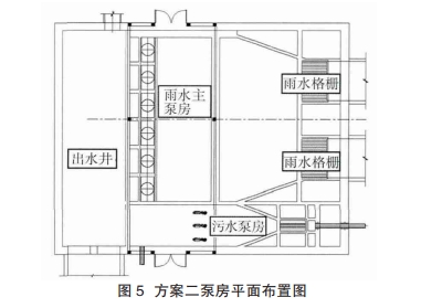 方案二。雨水泵房为雨水直进侧出的矩形泵房,在雨水泵房外侧设置污水截流泵房,侧向出水。主泵房上部设置设备间、变配电间及控制室(见图5)。