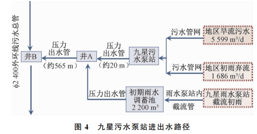 九星污水泵站平时接纳九星东块地区的旱流污水,雨天降雨结束后,除地区污水外还有地块初期雨水弃流排入。泵站集水池内的污水经潜水泵提升后,于设于泵站内的A#井与雨水泵站下部设置的初期雨水调蓄池放空泵出水管汇合,经压力出水管接人苏州河六支流∅2400污水总管,压力出水管设计管径DN400,长度共计约585m。泵站进、出水路由示意如图4。