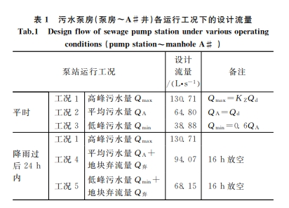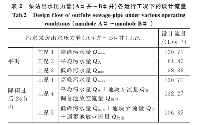 为保证控污设施的运行效果”,系统初期雨水弃流应于降雨过后24h内排空,考虑到污水泵站及下游管网设备配置及运行的稳定性,调蓄池均拟于每场降雨后按16h的放空时间错峰排放。结合前文中所列各水量分析,污水泵房及出水压力管在旱天及降雨过后24h内共有5种不同的运行工况,分别如表1和表2所示。污水泵房集水池水位根据《城镇排水泵站设计标准》(DGJ08-22-2018)[8]中的相关要求,结合上位污水规划计算得到;污水泵房出水管接入外环线总管处(井B)水位根据相关管理单位提供的资料确定。
