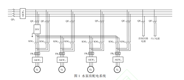 图1为现有自来水厂、二次加压泵站水泵房配电系统示意图,主要由异步电机G、变频器INV智能电量采集装置 AKW、空气开关 OF、接触器KM和热继电器FR等设备构成。图中的数字为对应设备编号:AKW;具有通信功能,实现三相电压线电压、三相电流/线电流、功率因数、率、有功功率、无功功率等电气参数的实时监测和计量,安装于主回路以及各回路电机的输入端。